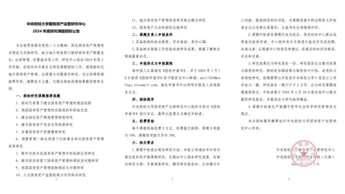 为全面贯彻落实党的二十大精神,深化国有资产管理有关理论与实践研究,助力地方财政部门做好国有资产配置优化、运营管理、存量盘活等工作,研究中心结合2024年度工作安排,在校内外开展自主研究课题招标工作,围绕新时代地方国有资产管理、运营重大问题展开研究,充分发挥桥梁纽带作用,凝聚各方力量,为强化财政资源统筹提供智库支持。