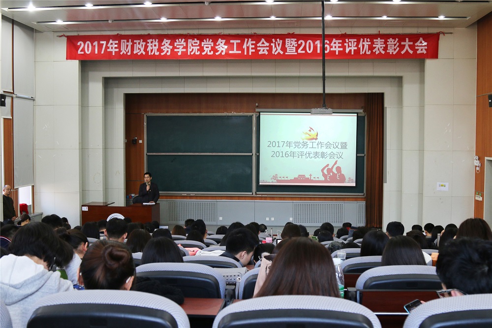 会议首先对2016年度先进集体和个人进行了表彰。陈宇等9人被授予优秀党务工作者;杨志清等8位教师,刘家豪等13位同学被授予优秀共产党员;同时表彰了9个优秀党支部,包括协同创新中心党支部、16税务党支部、15财政学党支部、第三本科生党支部、第一本科生党支部、税务管理党支部、国际税收党支部、财政党支部、财政管理党支部。院组织员李飞霞、院长白彦锋、党委委员、副院长任强、何杨、党委书记樊勇代表党委分别为先进个人和集体颁奖。