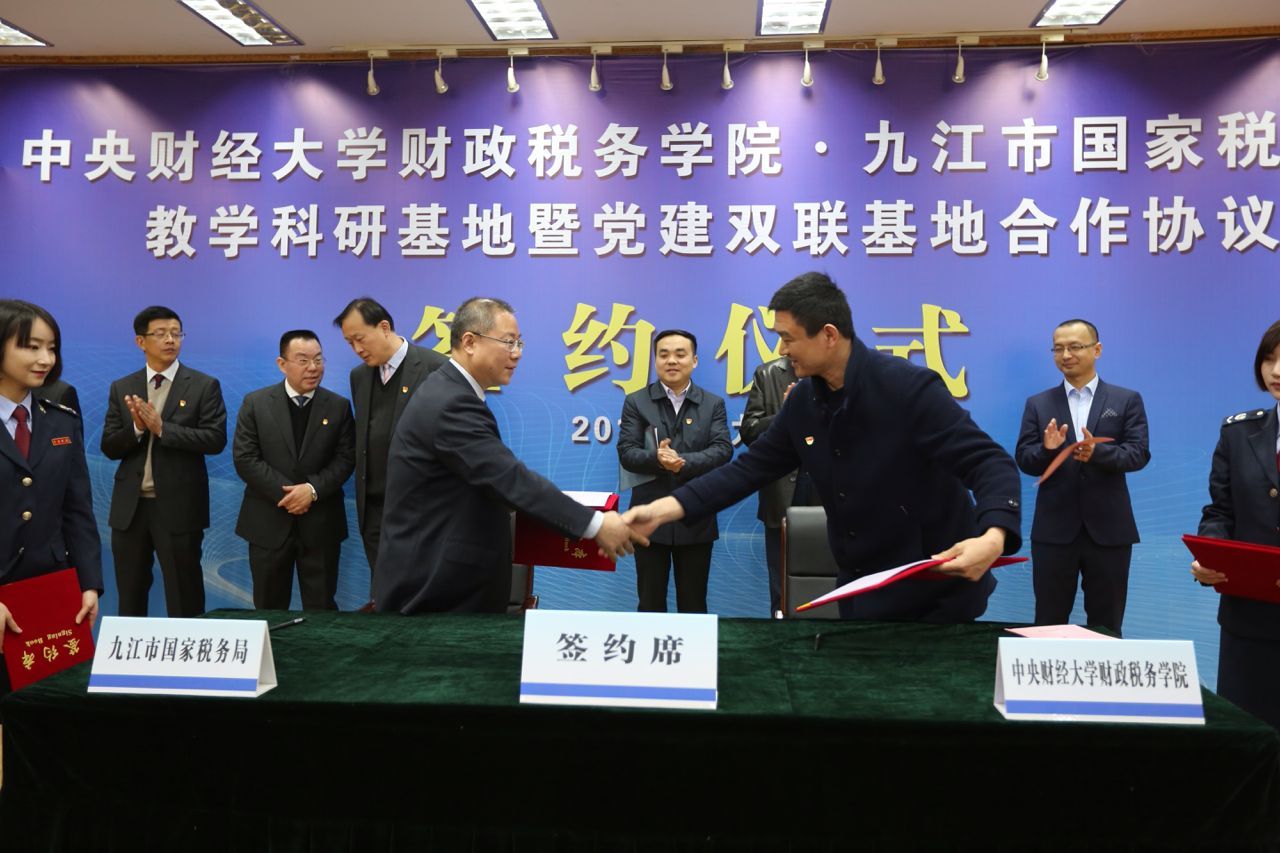3月16日上午,新葡的京集团8814与九江市国税局教学科研基地暨党建双联基地合作协议签约仪式在九江市国税局三楼会议室隆重举行。九江市国税局各县(市、区)局主要负责人、市局直属单位班子成员、市局机关全体干部在主会场参会。新葡的京集团8814党委书记樊勇教授、副院长任强教授、刘桓教授、李严波老师参加了签约仪式。仪式由九江市国税局党组副书记、副局长裘庆平主持。