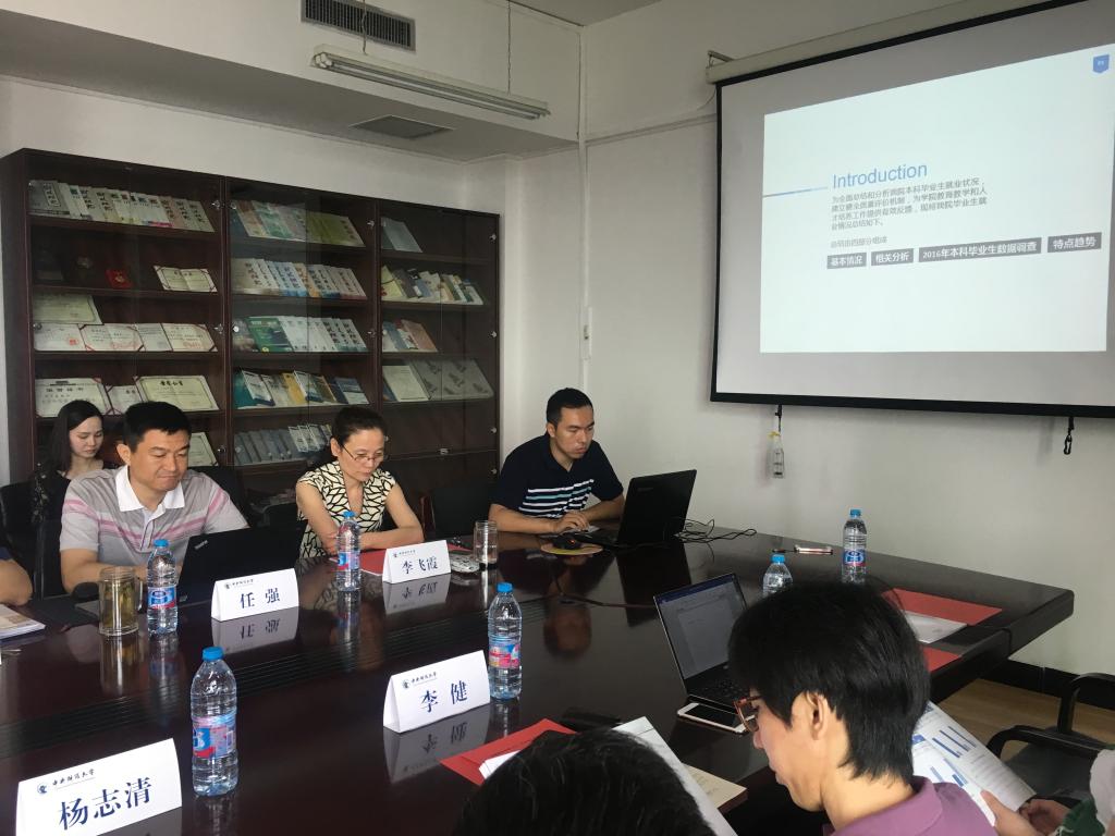 学生处李健副处长和教务处聂建峰副处长分别根据汇报情况发表了个人看法。李健副处长指出,当前的就业统计报告大都以校级为主,很少关注到院级。从报告结构和专业性的角度来看,新葡的京集团8814本科生就业分析报告是科学、严谨的,他希望学院能够继续保持这种优良做法,为本科生人才培养和就业工作作出积极的贡献;聂建峰副处长指出,从目前学院的学生工作来看,必须加强与各职能部门的沟通和融合,招生、就业和教育教学相关部门要统一步调,形成合力。同时,他还指出,教务处希望与学院积极协作,共同开发与就业培训有关的系列课程。