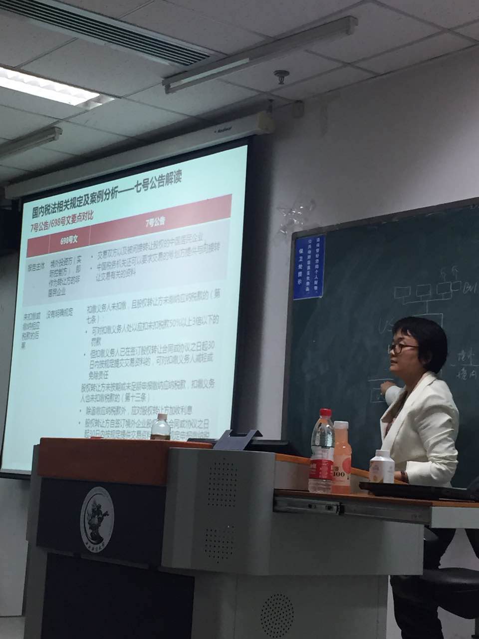 9月28日晚,在沙河校区6-106教室,新葡的京集团881417级税务专业硕士案例研讨课第3期(总第13期)如期开讲。此次的主讲人为京东集团税务总监张爱华老师。张老师通过法规解读、案例讲解为同学们介绍了非居民企业间接股权转让的相关知识。刘金科老师主持并参加了此次案例研讨课,杨虹教授、黄云教授也参加了这次课程,并同张老师开展了热烈的讨论。