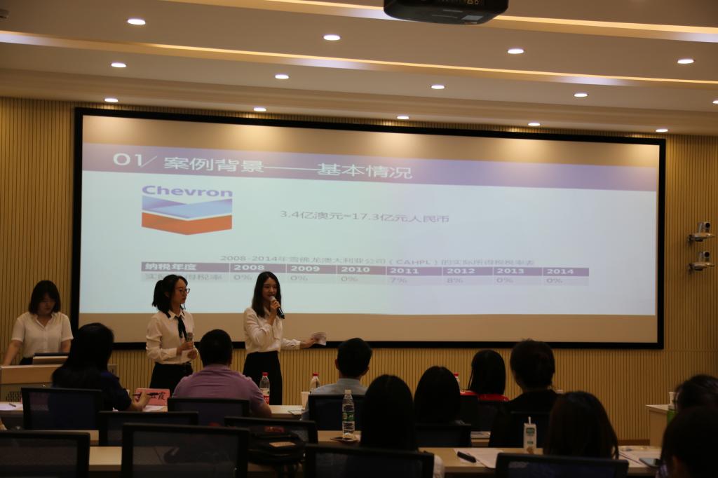 龙佳希队和王思月队分别抽到第一名和第八名的展示顺序。进行第一个展示的龙佳希和张雪麒同学虽然充满压力,但在展示过程中,这两位同学大胆地采用“税务案例大讲堂”的展示方式,将案例浅显易懂的剖析给大家。她们以澳大利亚雪佛龙集团税务案为基础,通过结合澳大利亚及美国税法的相关规定,分别从雪佛龙集团的离岸融资结构、集团关联融资安排被重新定性的原因以及集团所涉及的双重征税风险进行分析,探讨了关联交易的独立交易原则,并对案例所引发的问题进行了进一步思考,为我国企业在后BEPS浪潮下 “走出去”提供参考。她们在问答环节中的表现也是可圈可点,面对评委们的犀利提问,不仅表现出强大的心里素质,也展现了新葡的京官网学子扎实的专业素养,给这场比赛开了个好头。