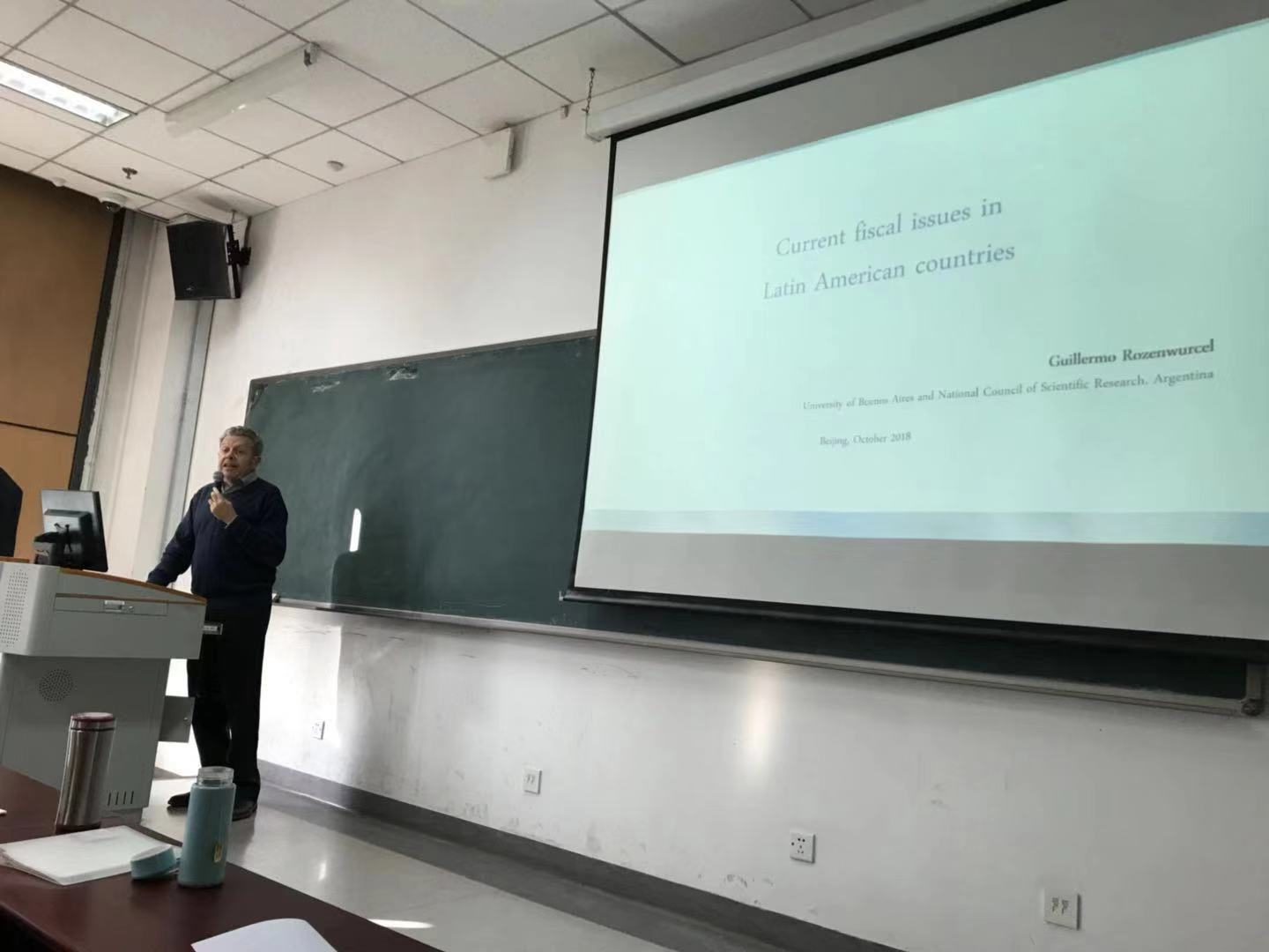 2018年10月24日下午,布宜诺斯艾利斯大学和国家科学研究委员会教授,曾任美洲开发银行研究部首席经济学家的Guillermo Rozenwurcel教授应新葡的京集团8814之邀在新葡的京集团8814沙河校区主教学楼405作了题为“拉丁美洲国家当前财政问题”的学术报告。财税学院2018级学术型硕士、法学院博士硕士和财税学院的部分老师等40多人参加了讲座,讲座由姜爱华老师主持。
