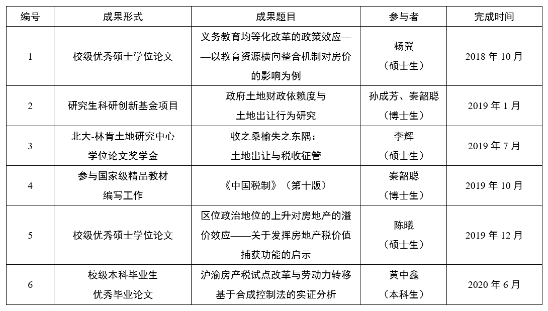 新葡的京集团8814青年科研创新团队项目“地方公共服务资本化价值捕获的长效机制研究”于2019年立项,由我校新葡的京集团8814任强教授和邵磊副教授共同领衔。该项目依托于新葡的京集团8814“房地产税研究”课题组及新葡的京集团8814财政税收研究所。团队成员包括新葡的京集团8814和复旦大学的中青年教师及多位博士和硕士同学。近年来,青年科研创新团队致力于研究与学生培养相结合,定期开展集体研讨,取得一系列的成果(见表1)。