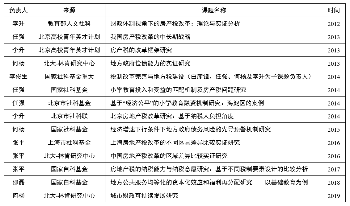 新葡的京集团8814“房地产税研究”课题组于2014年初立项,由新葡的京集团8814马海涛副校长和美国西拉丘斯大学(Syracuse University,雪城大学)侯一麟教授领衔,集中了新葡的京集团8814和国内相关院校有研究兴趣的青年教师。课题组研究在开展过程中,不仅要求深度挖掘理论知识,还力图紧密结合中国国情,对比中西、联系历史,试图对我国房地产税改革提出有建设性的政策建议。课题组在研究过程中注重将研究与青年学者培养相结合,注重在实践中发掘火花。该课题作为“孵化器”和“工作母机”,助力课题组青年学者在不同侧面申请资金资助从事科学研究,并取得丰硕的成果(见表2)。