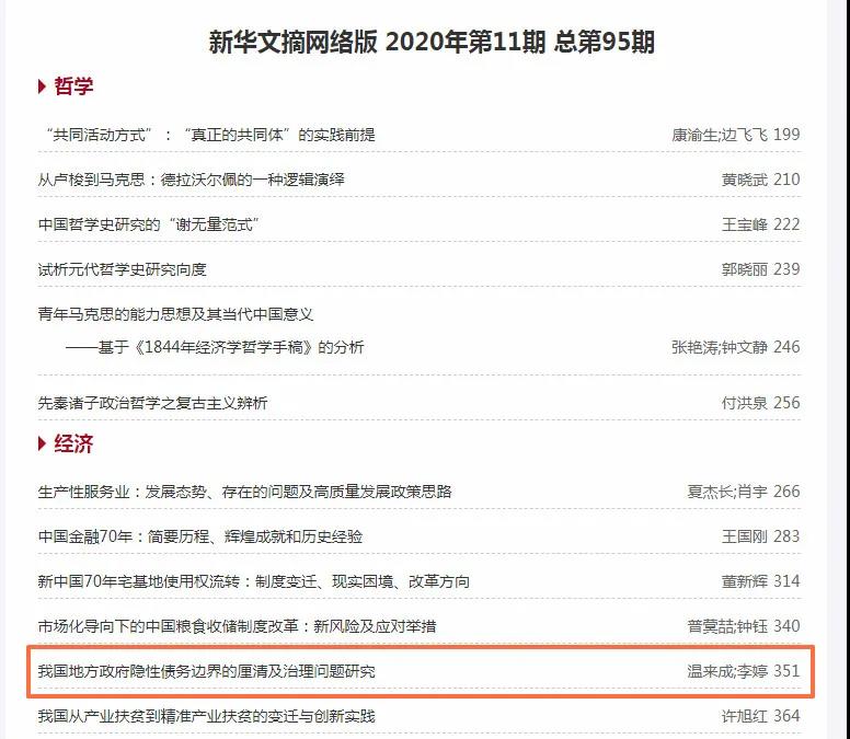 近日,财税学院温来成教授和学生李婷在《新葡的京集团8814学报》发表的论文《我国地方政府隐性债务边界的厘清及治理问题研究》被《新华文摘网络版》转摘。