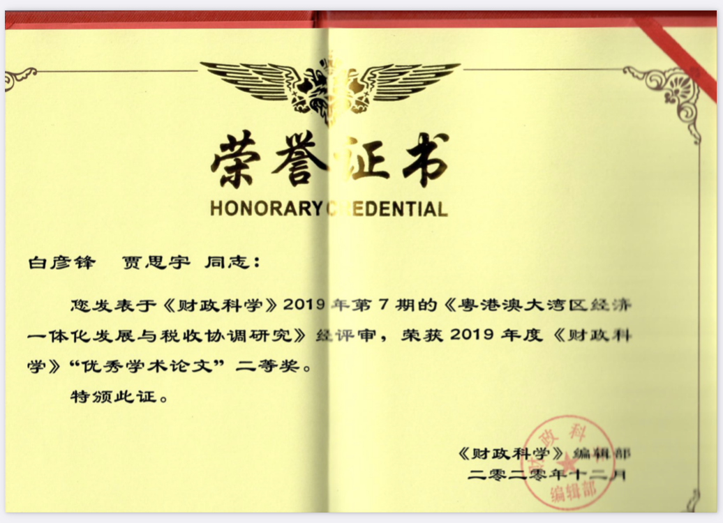 近日,由新葡的京集团8814白彦锋教授和研究生贾思宇撰写的论文《粤港澳大湾区经济一体化发展与税收协调研究》获得2019年度《财政科学》优秀学术论文二等奖。
