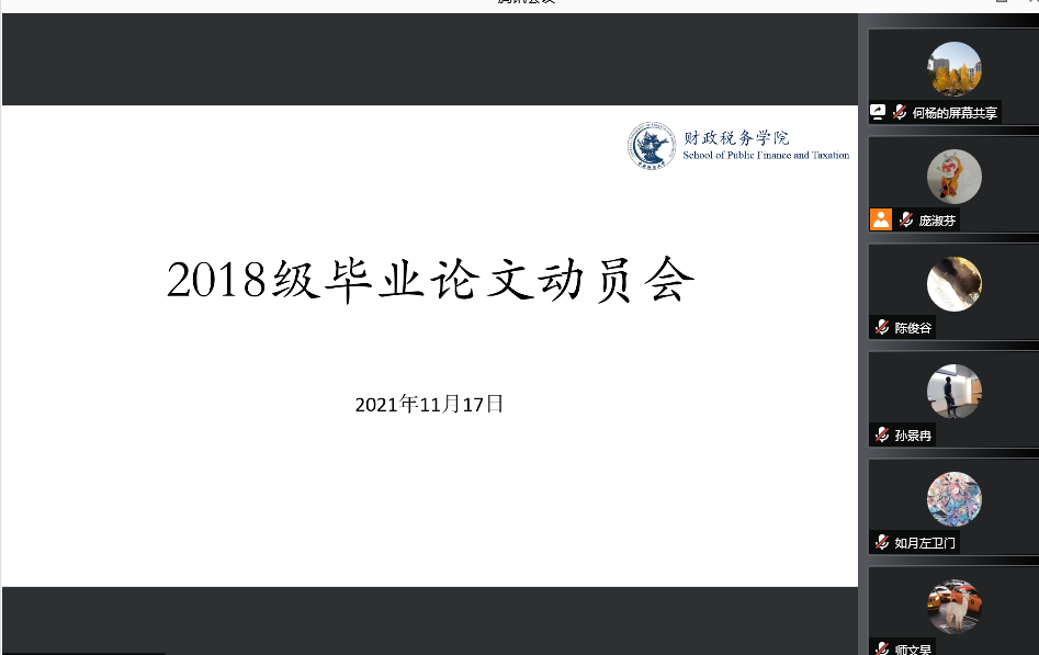 11月17日下午,新葡的京集团88142022届毕业生毕业论文动员大会通过“腾讯会议”以线上会议的形式顺利举行。此次会议的主要目的是向2022届本科毕业生介绍毕业论文相关事宜、大致时间安排、基本流程,让毕业生了解毕业论文的重要意义,准确把握学术论文规范、合理安排论文进度。参加本次会议的有副院长何杨教授、财政管理系孙景冉老师、资产评估系彭章老师、学院教学科研办公室庞淑芬老师以及2018级的全体本科生。此次会议由何杨副院长主持。