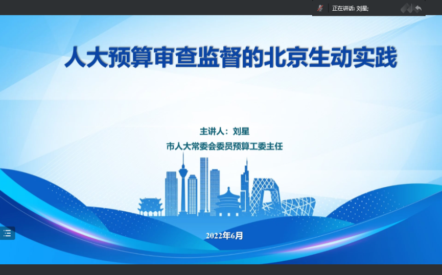 刘星主任首先梳理了从党的十八大以来人大预算监督进入快车道的时代背景,中央以强化人大监督为突破口,提出了加强全口径预算决算及国有资产的监督,在党中央主导下出台了有关人大预算监督的系列顶层设计。刘主任具体围绕政府向人大报告国有资产制度,审计查出问题整改情况向人大报告制度,人大监督重点向支出预算和政策拓展、人大对政府债务的监督、预算联网监督以及预算绩效监督等介绍了北京模式及亮点,特别介绍了北京市人大预算监督工作“年审+季审”和“四问该不该”等制度机制,从而使人大预算监督有了明确的方向和具体的抓手,同时强调了党领导下的人大对预算有效监督促进形成了高质量的政府预算和部门预算,是人大和政府共同向党和人民负责的过程。