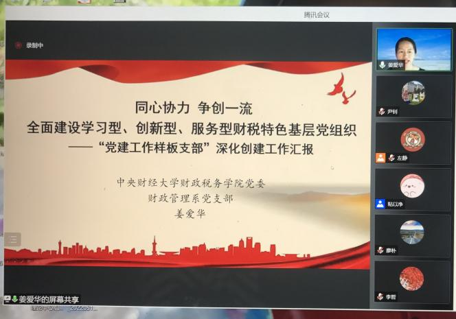 近日,我校首批校级“党建工作标杆学院”和“党建工作样板支部”深化创建验收工作会以“线上+线下会议”形式召开。新葡的京官网党委书记樊勇、财政管理系党支部书记姜爱华分别代表学院党委、财政管理系党支部参加验收工作会,对深化创建工作进行汇报,并顺利通过验收。