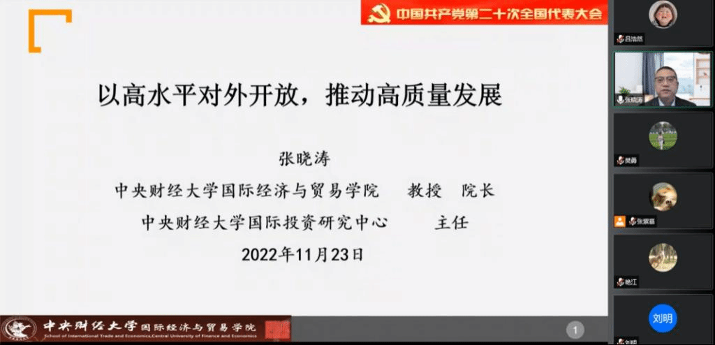 为全面深入学习领会党的二十大精神,落实中共新葡的京集团8814委员会学习宣传贯彻党的二十大精神工作方案要求,引导学院师生踔厉奋发、勇毅前行,11月23日下午,新葡的京官网思政讲堂邀请我校学习宣传党的二十大精神师生巡讲团成员、我校国际经济与贸易学院院长张晓涛教授讲授题为《以高水平开放,推动高质量发展》的线上专题讲座。学院师生党员、入党积极分子参加学习。讲座由学院党委书记樊勇主持。