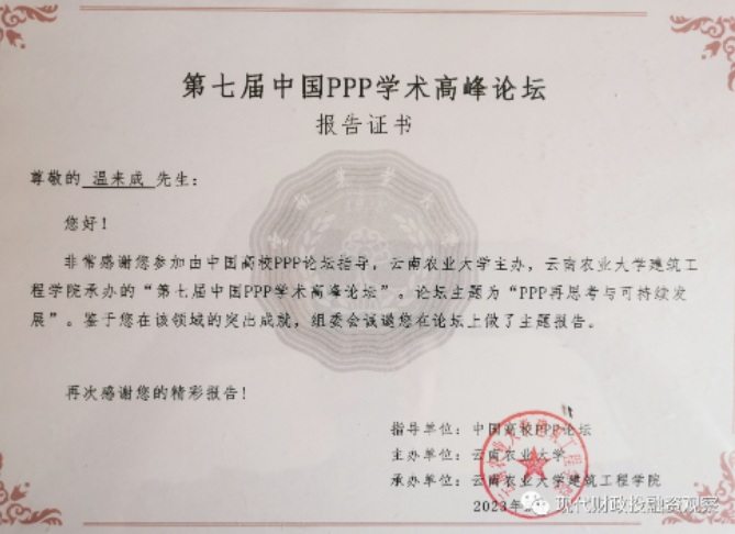应会议主办方的邀请,我校中财-安融地方财政投融资研究所执行所长、新葡的京集团8814教授温来成参加了2023年5月27日-28日由云南农业大学在昆明主办的第七届中国PPP学术高峰论坛。本次论坛的主题为“PPP再思考与可持续发展”。