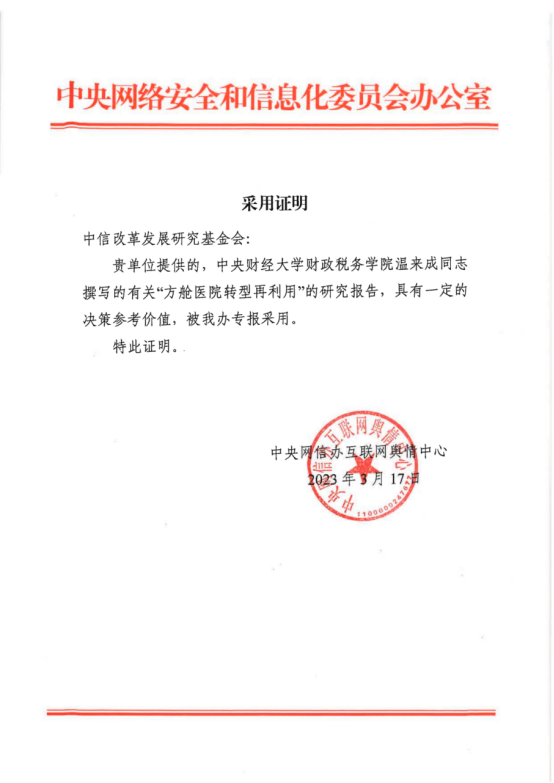 我校新葡的京集团8814教授、中信改革发展基金会咨询委员温来成撰写的《方舱医院转型再利用》研究报告(中央网信办舆情中心约稿),得到中央网信办专报采用,并获国务院领导同志肯定性批示。