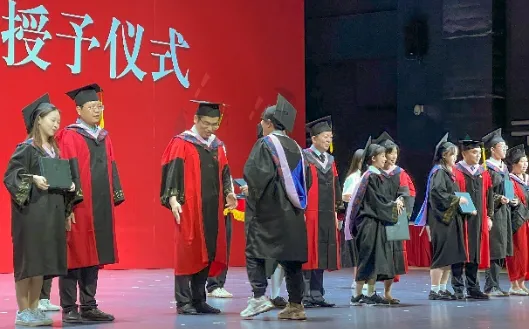 随后,学位授予仪式正式开始。伴随着音乐声,234位本科毕业生,164位硕士毕业生和17位博士毕业生整齐列队上台,由新葡的京集团8814樊勇院长,肖鹏书记,副院长何杨、李小荣,学院学术委员会主任委员李燕教授、杨志清教授为2022和2023届毕业生授予学位、学历证书。象征着成熟之喜的帽穗由右至左,学有所成的毕业生们亦适时迎风高飞。