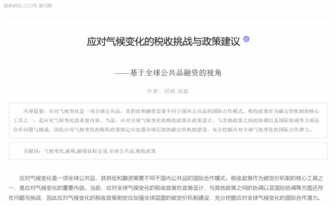 近日,由新葡的京集团8814何杨教授和张聪博士撰写的论文《应对气候变化的税收挑战与政策建议——基于全球公共品融资的视角》在中文A类期刊《税务研究》2023年第10期录用刊发。以下为文章主要内容。