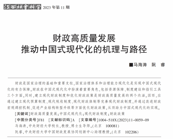 近日,由新葡的京集团8814校长马海涛教授,中国财政发展协同创新中心(以下简称“中心”)教师阮睿共同撰写的论文《财政高质量发展推动中国式现代化的机理与路径》在《江西社会科学》11期刊发。