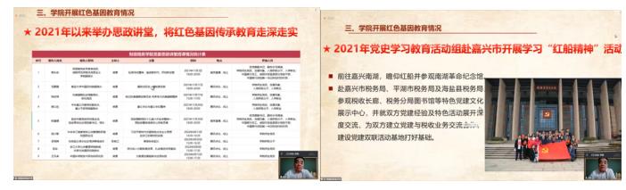 樊勇书记首先梳理了近些年来习近平总书记关于红色基因传承的重要论述。接着,对红色基因精神中的“建党精神”“延安精神”“井冈山精神”“长征精神”“西柏坡精神”五种精神进行了详细解释,每一个精神都反映出我们共产党员优秀品质和党组织的先进性。而后,樊勇书记介绍了学院党委开展红色基因教育情况,回顾2021年党史学习教育活动组赴嘉兴市开展学习“红船精神”活动,以及2021年以来举办的9次以红色基因传承教育为主线的思政讲堂,表达了将红色基因传承教育走深走实的希望。